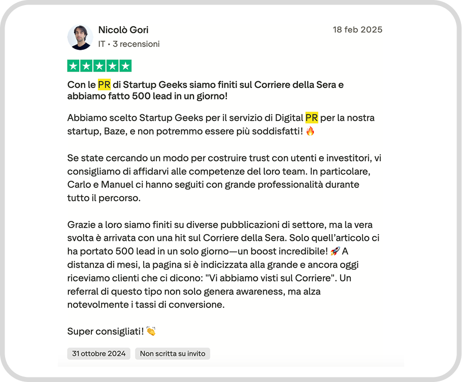 I primi articoli escono di solito entro 30-45 giorni. Dal secondo mese arrivano le prime pubblicazioni su testate tier-1 e i primi effetti concreti su lead, investitori e awareness. Monitoriamo tutto con report mensili misurabili.