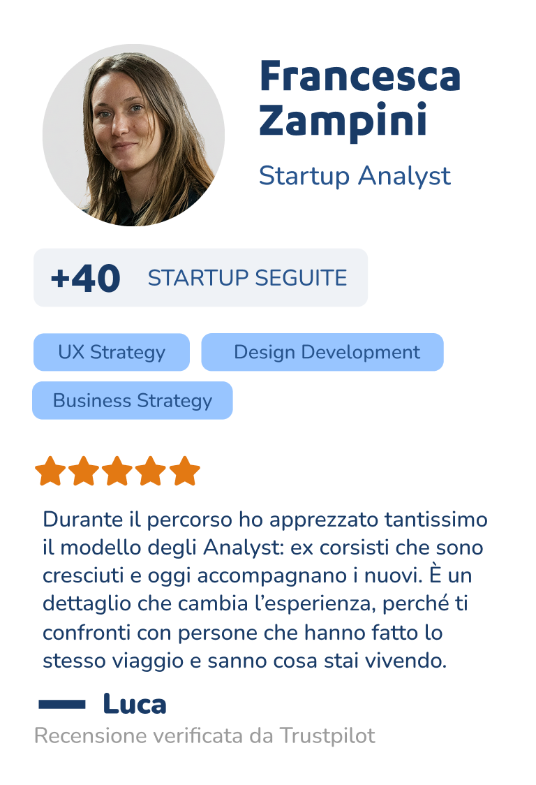 Il tuo analyst personale studierà il tuo progetto, ti dàrà feedback concreti ogni settimana e porterà con sé l'esperienza di centinaia di founder già seguiti.