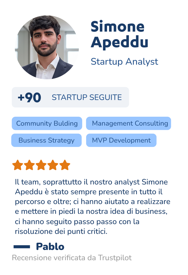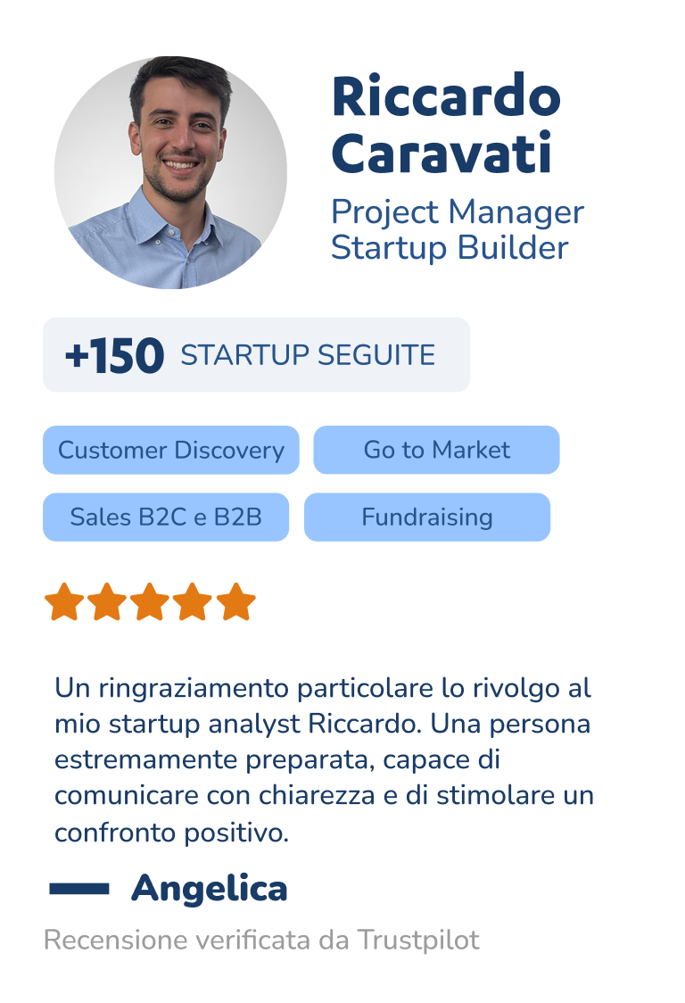 Il tuo punto di riferimento 1:1 che conosce la tua idea, segue i tuoi progressi ogni settimana e ti dà feedback personalizzati in ogni fase del percorso. Avrai office-hour e consulenze dedicate.